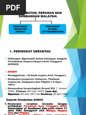 Penglibatan peranan dan sumbangan Malaysia dalam ASEAN DRAFT. Kini ASEAN mengandungi sepuluh anggota dengan penambahan negara Kampuchea Laos Brunei Vietnam dan Myanmar. Bagi menjamin keamanan dan kestabilan politik rantau ini Malaysia bersama Negara ASEAN lain telah bekerjasama dalam I Forum Serantau ASEAN II Perjanjian Perdagangan Bebas AFTA III Peraturan Perdagangan Istimewa ASEAN IV Perjanjian Zon Bebas SEnjata Nuklear Asia TenggaraSEANWFZ.